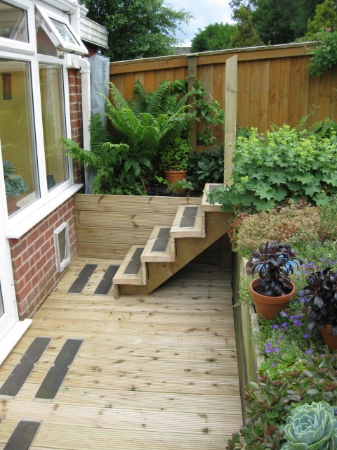 These are images of decking and replacement steps. The decking was laid on top of the old tired deck and the steps were replaced reusing anti-slip pads. Tannalised redwood has been used, with a 10 year anti-rot guarantee – not to be mistaken for whitewood pressure-treated decking which some suppliers stock. This redwood will not twist or shrink and is superior in quality.