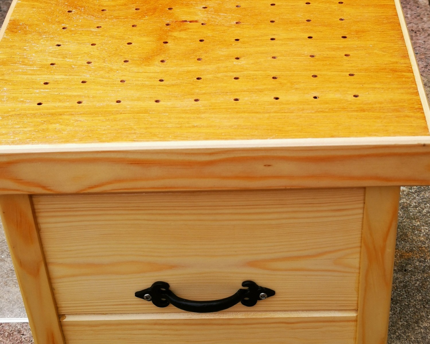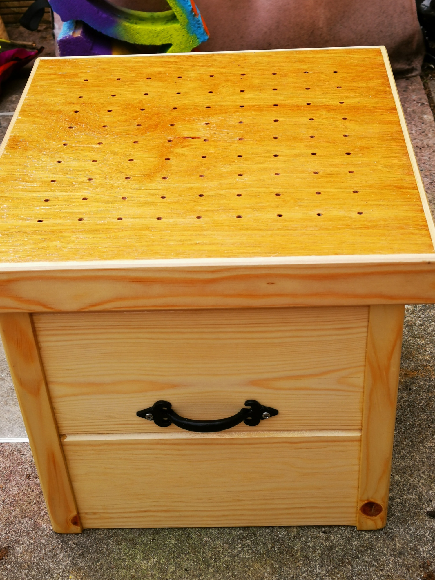 Using the off cuts of TGV from a garage door I am making and some Marine plywood I came up with this box. The vent holes are 4mm in diameter which after some experimentation proved to be the exact size hole to allow air in but keep water out. The whole piece was finished with three coats of varnish.
