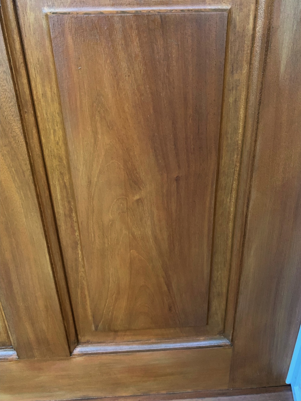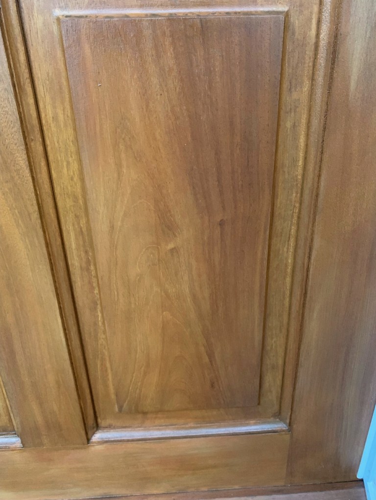 Being a 36 inch wide door a replacement of similar design would be in the region of £1000. After removing the various bits attached to the door, a thorough sanding and finishing with 3 coats of light Oak Satin varnish the end result looks very presentable.