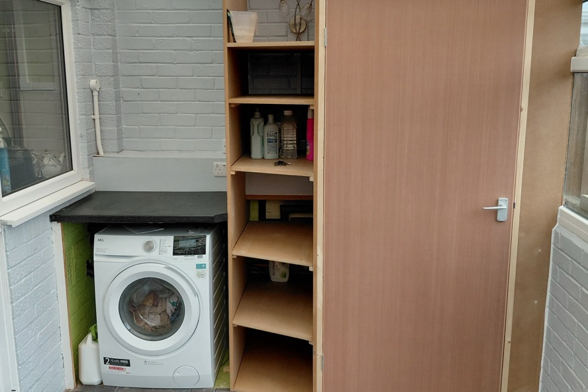 Having had a heat pump fitted the resultant tank and pipe work now needed boxing in with a useful shelf unit and a ply flush door serving as access to the tank and pipework behind.
